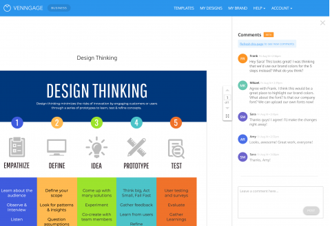 Polish your single-page design with your team in real-time, leave comments on each other’s work, and keep your designs organized in one shared team folder.