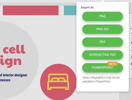 Work with existing solutions. Export your designs as PowerPoint, HTML, Interactive PDFs, PDFs and HD PNGs. These options continue to grow so that you have the versatility to work with existing tools.